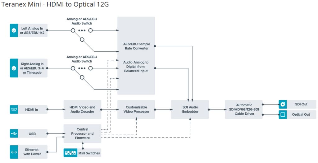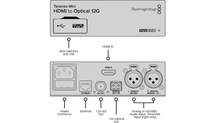 The Teranex Mini HDMI to Optical 12G Converter also features full-size XLR inputs that are switchable between balanced analog and AES/EBU digital audio, and allow you to connect separate audio. The converter also has an Ethernet port, allowing you to manage the converter remotely from a Mac or Windows computer using the included Converter Utility software. This feature is especially useful if you are in a larger facility where many converters are in use.
