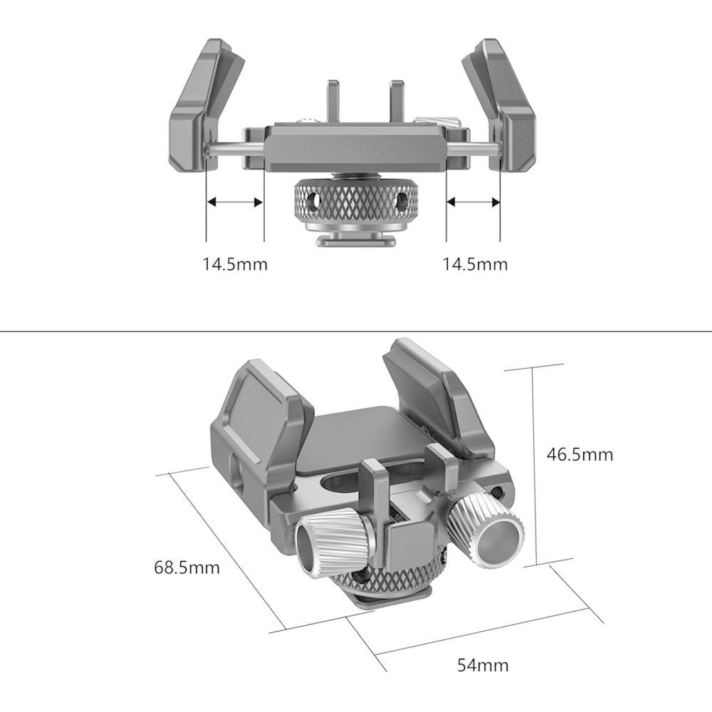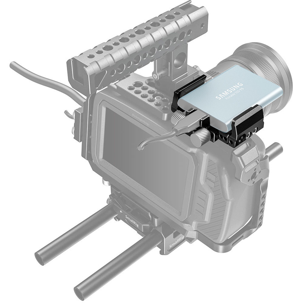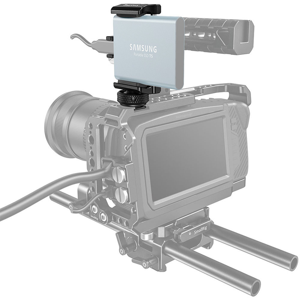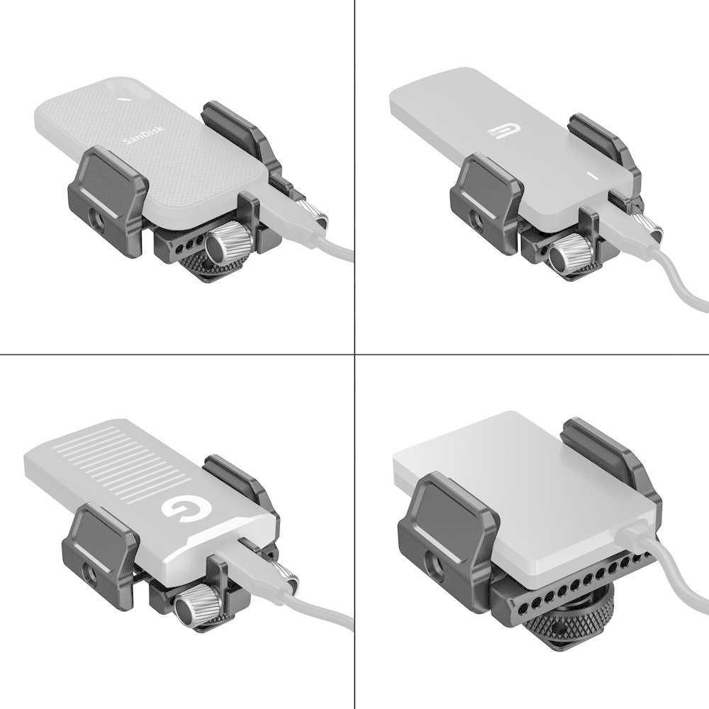 The SmallRig Universal Mount for External SSDs is designed to mount an SSD to cameras such as Blackmagic Pocket Cinema Camera 4K and 6K models. This spring loaded clamp extends on both sides and fits various SSDs such as Samsung T5 and T7 SSD, Angelbird SSD2go PKT, Glyph Atom SSD, SanDisk 1T SSD, G-Technology G-DRIVE Mobile SSD and more. It comes with a detachable cold shoe that can be attached to the bottom or side of the mount, allowing you to mount the SSD to a cold shoe adapter; or after removing, you can use 1/4" -20 screws to mount the holder, which is super flexible. The holder has soft protective rubber pads inside, which keeps the SSD firmly in the clamp and prevents scratches. Moreover, it comes with a cable clamp to secure the USB-C cable, fastened with a button screw, this SSD mount is compact and versatile for photographers and video shooters.