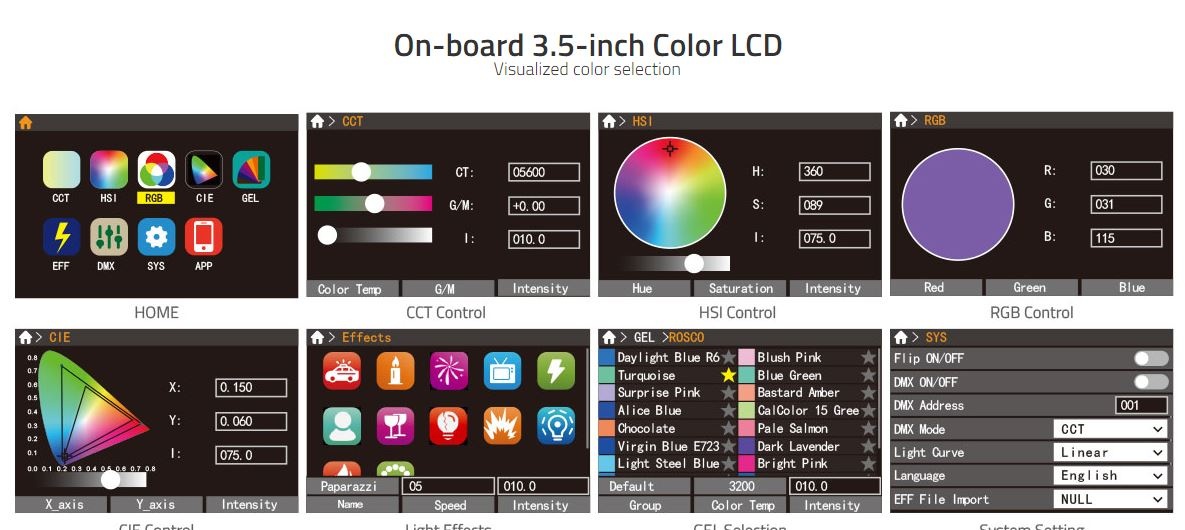 - CCT/HSI/RGB/CIE/GEL/EFF color modes