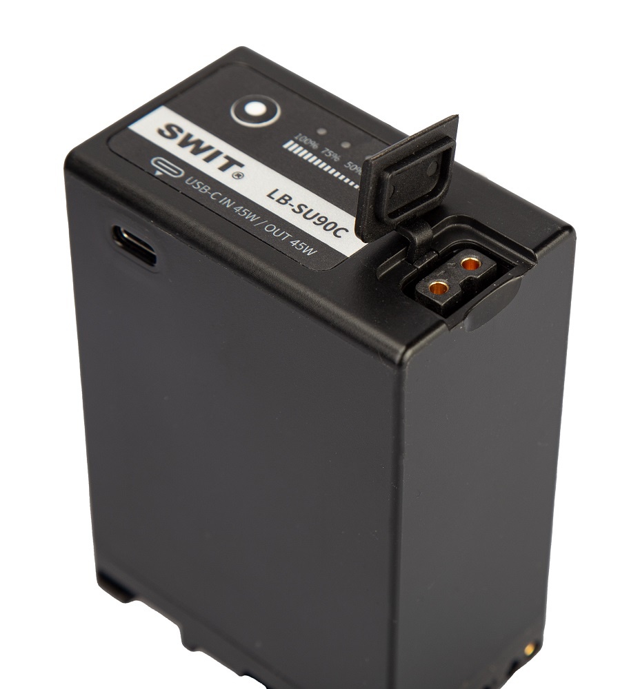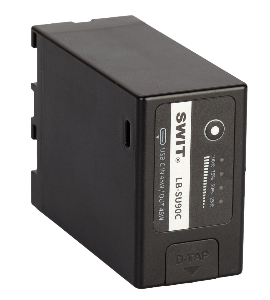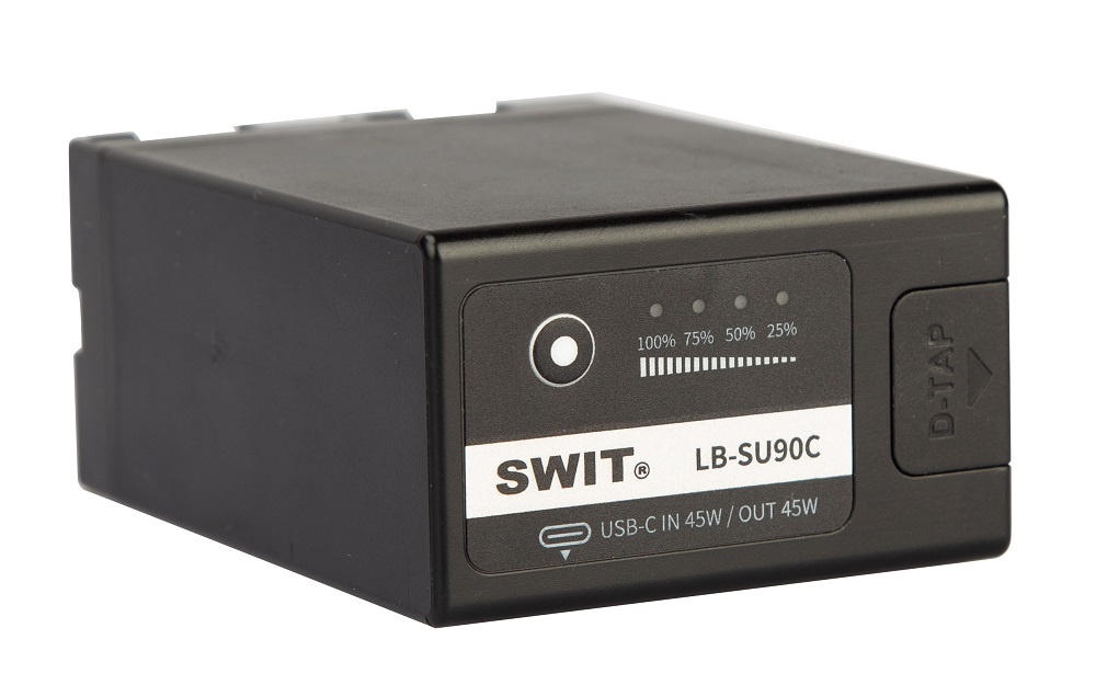 The Swit LB-SU90C can be charged by SWIT S-3602U 2-way charger, SWIT PC-U130B2 D-tap charger, or LC-D421 4-way charger. By the LC-D421, You can charge 4 batteries simultaneously, and fully charging within 3.5 hours.