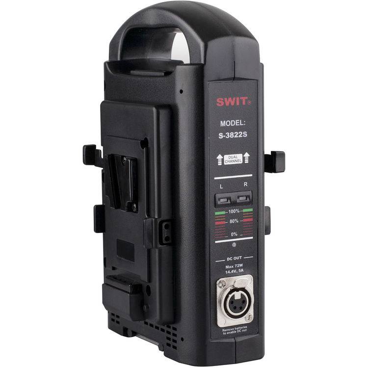 The portable charger S-3822S can charge 2 V-mount batteries simultaneously. S-3822S has LED charging indicators on the front panel, indicates the real time capacity of each channel by different colors. S-3822S has a 4-pin XLR female connector on the front panel. Connected with SWIT S-7102 XLR female to male cable, the S-3822S can be used as AC-DC adapter or DC 14.4V, 5A, 72W output.